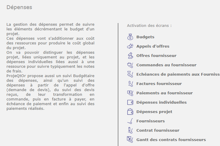 ProjeQtOr réunit en une seule solution tout ce dont vous avez besoin pour gérer vos projets avec efficacité :