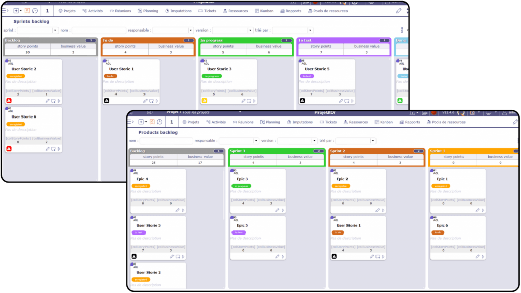 - Product Backlog : répartition dans les sprints et vision globale de l’avancement